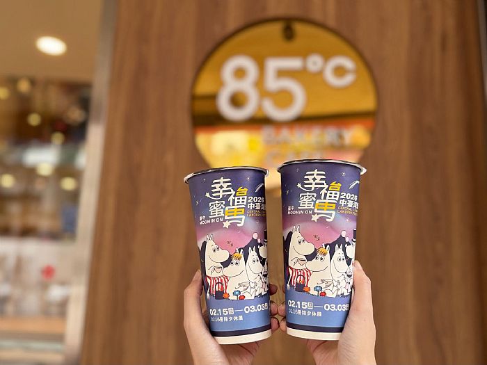 2月9日起,85℃台中門市的大杯飲料杯換上幸福蜜馬,2026中台灣燈會主視覺,杯身印有姆明一族(The Moomins)席地而坐野餐的可愛模樣,喜歡姆明的粉絲別錯過機會收藏。