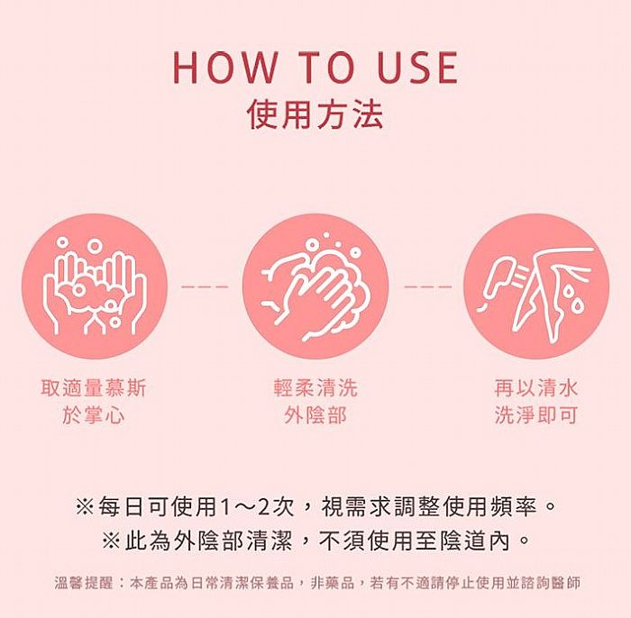 ➤如何使用?JIUJIU 親親潔淨舒護私密慕斯使用方法非常簡單,取適量慕斯輕柔的清洗外陰部,再用清水洗淨即可,每日可以使用1-2次,日常洗澡清潔多一個小步驟,就能讓私密處更健康,妹妹健康不癢癢就能自在安心活動一整天!