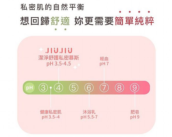 ➤弱酸溫和pH值JIUJIU 親親潔淨舒護私密慕斯,是最友善私密處的pH值3.5~4的弱酸性,一般沐浴乳pH值鹼性高,清潔力太強,反而會破壞私密處酸鹼平衡。