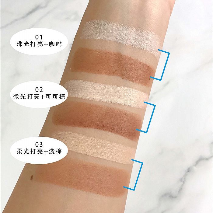 01 珍珠白打亮+咖啡修容珍珠白搭配咖啡色修容,整個對比感很明顯,輕輕畫就很有輪廓感,很適合喜歡妝感比較立體、偏濃顏系的人。02 閃光珍珠打亮+可可棕修容這組超百搭,自然膚色用起來剛剛好,日常上妝不會太誇張,但又能默默讓臉變立體,是平常出門或上班都很適合的一款。03 白皙膚打亮+拿鐵棕修容專門為白皙膚色設計,顏色偏柔和,修容效果自然,臉看起來小一點但不突兀,淡妝派一定會喜歡。