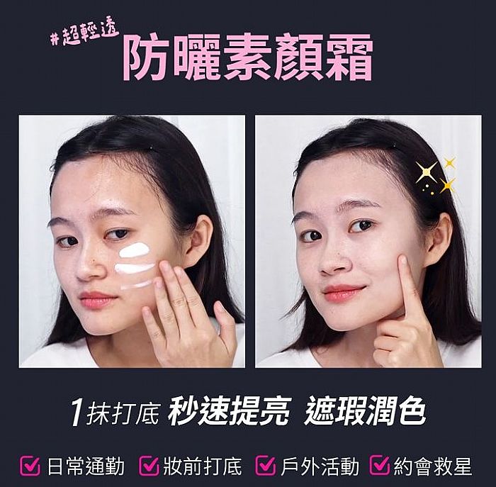 不需要用手塗,只要輕輕一劃,不顯色,質地輕盈,有「遮蓋毛孔」的效果,添加「去油配方」,有效吸附油脂,並調節護理皮脂,減少出油,控油+高效防曬就是這麼簡單!