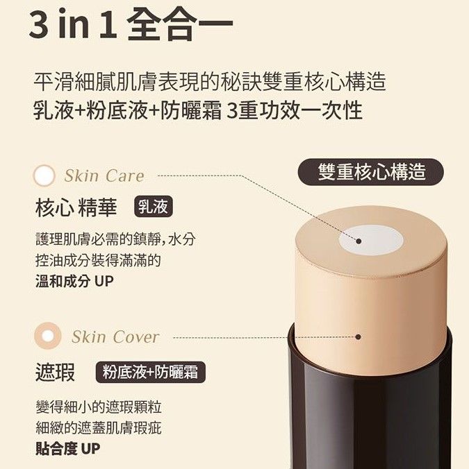 雙核心設計,中間兼具「保養+控油」效果,外圈是「粉底液+防曬霜」,服貼度很高,能夠遮蓋大部分的肌膚瑕疵,而且持妝24小時,對於只是想提亮氣色&遮蓋痘疤的男生來說,這支3in1的粉底棒,一支就能快速達到修飾+防曬的需求!