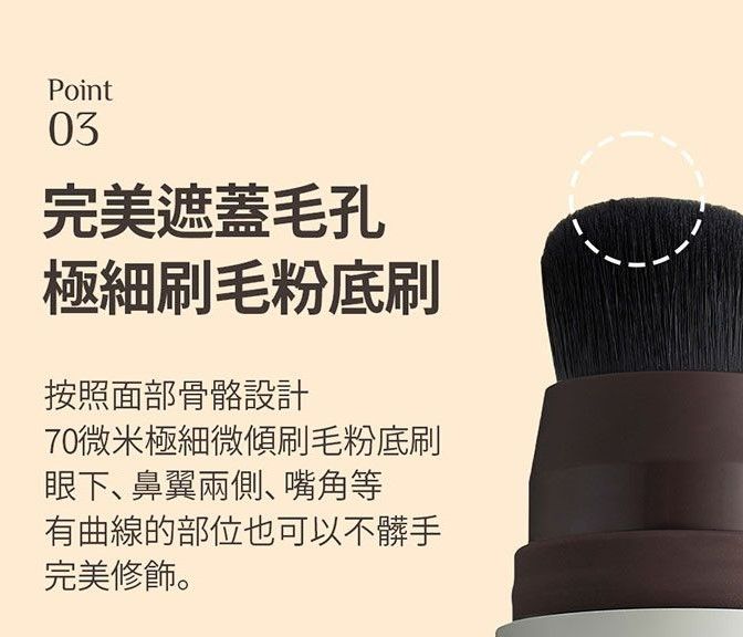 使用OBgE 自然遮瑕粉底棒,不用另外準備上粉底工具,另一頭自帶粉底極細粉底刷,按照面部骨骼設計,讓粉底可以更貼合肌膚,完美隱形毛孔,眼下、鼻翼兩側和嘴角等有曲線的地方,都能輕鬆上出服貼無痕底妝。