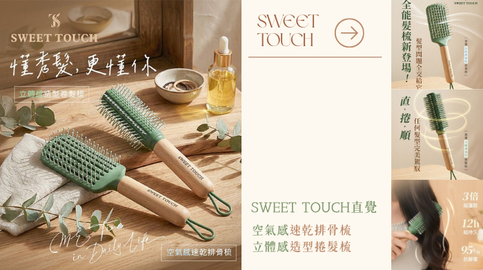 時尚 03/10一梳就蓬鬆有型!SWEET TOUCH 直覺空氣感速乾排骨梳,3D弧形梳面,不傷髮質更快乾;直覺立體感造型卷髮梳,直捲兩用一支搞定,靠這兩支梳出有精神的蓬鬆秀髮