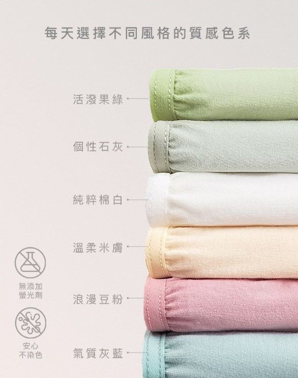 親親純棉日拋內褲採100%精梳棉,材質平滑細緻親膚,不會有免洗內褲薄透的單薄感,果綠/灰藍/豆粉/米膚/石灰,5種質感色一次擁有!