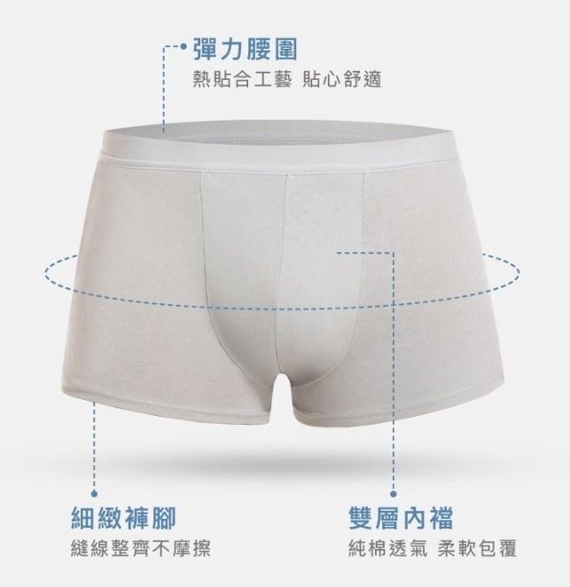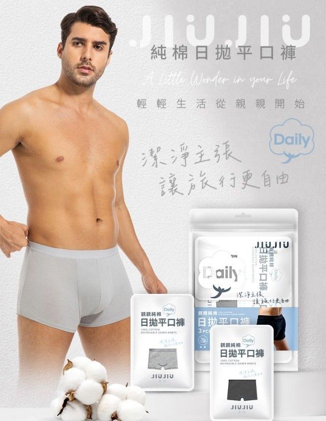 男生著用的JIUJIU 親親純棉日拋平口褲,一樣是獨立包裝,100%純棉,柔軟親膚材質,維持全天乾爽透氣。