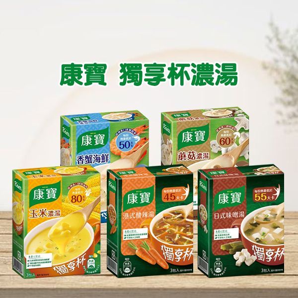 康寶 獨享杯濃湯,30秒沖泡即飲,不添加人工防腐劑,每份熱量低於80大卡,早餐、午茶和宵夜的好朋友。