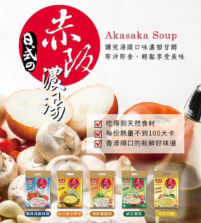 全程台灣製造的廣吉 赤阪濃湯,四種口味可選:蟹味海鮮味噌、玉米巧達濃湯、馬鈴薯蘑菇濃湯、納豆南瓜野菜濃湯,每一包熱量不到100大卡,想喝就喝也不用怕熱量高!