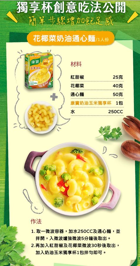 不只是濃湯,還可以做成多種創意料理,如義大利麵、燉飯等等,用一包濃湯沖泡包就能簡單變出多種菜色,料理小白也能輕鬆下廚!