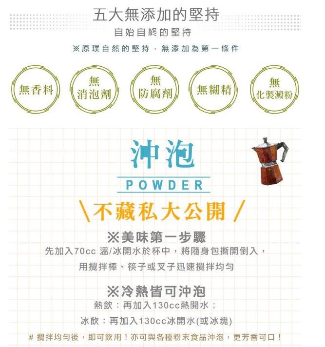 無添加香料、色素、防腐劑、消泡劑、抗結塊劑,喝了更安心,還可以搭配其他的粉類一起沖泡,比罐裝豆漿好保存,想喝再泡,不怕放到過期!