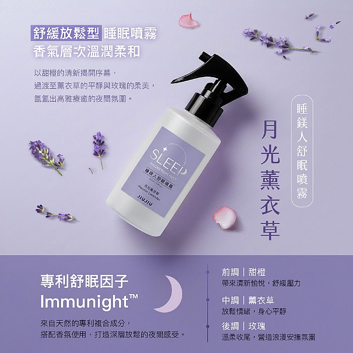 想要舒緩放鬆,就選擇親親JIUJIU睡鎂人舒眠噴霧-月光薰衣草。前調的甜橙香氣,有效舒緩壓力;中調薰衣草溫柔登場,幫助身心放鬆;最後以淡雅玫瑰作為後調,為整體香氣增添一抹柔美氣息。層層堆疊的香氛,為你的夜晚打造安心、寧靜的入眠氛圍。