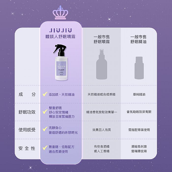 只要你有睡眠品質不佳、常常輾轉難眠,或是容易淺眠、多夢的困擾,親親JIUJIU睡鎂人舒眠噴霧都能幫助你改善這些問題,讓你更快入睡、睡得更深、更香甜。