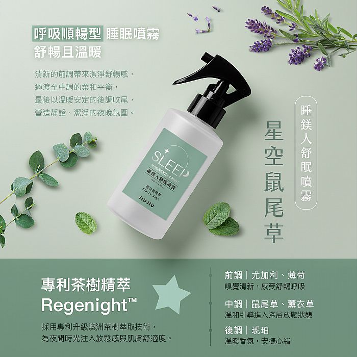 喜歡清新香氣的人,推薦選擇親親JIUJIU睡鎂人舒眠噴霧-星空鼠尾草。前調的尤加利與薄荷,帶來清爽舒暢的呼吸感受;中調融合鼠尾草與薰衣草,營造出深層放鬆的療癒氛圍;後調以溫潤的琥珀收尾,帶來潔淨又舒心的感覺,讓整晚的睡眠更加安穩自在。