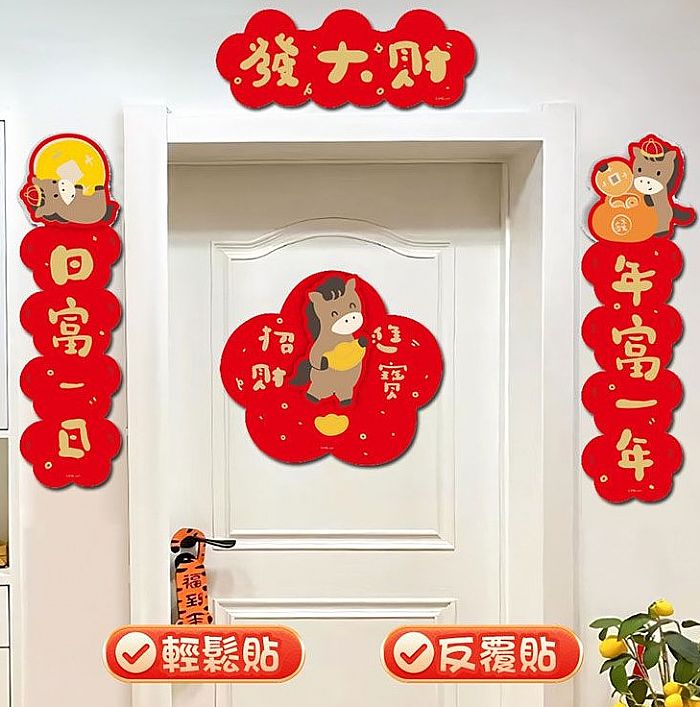 馬年貼馬圖案的春聯最應景!馬年門貼 (對聯4件),材質厚實,燙金設計質感加倍,可愛的馬兒圖案看了超療癒,還有蘋果的造型象徵平平安安,原來春聯也可以可可愛愛!