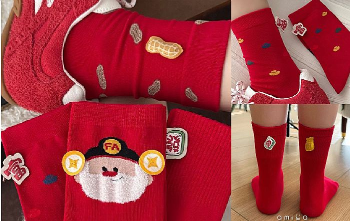 另外四款文青風襪子也超有創意!有「財神、發財、好事花生和暴富四款」,立體圖案超有趣,誰說紅色襪子很俗氣,這幾款設計喜氣又好看,過年穿上紅色襪子鐵定運氣爆棚!