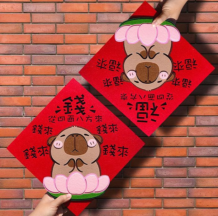 另外還有「卡皮巴拉毛氈磁吸對聯四件套」,一樣也是磁吸式,即貼即撕,一整套的卡皮巴拉對聯,貼在家裡或公司門口都可愛又喜氣!