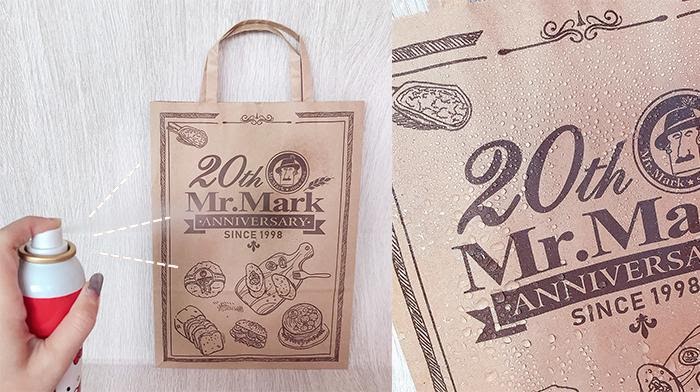 距離15-20公分噴勻,放置5-10分鐘完全風乾後,即能發揮良好的防護效果。有了防水噴霧的紙袋,再噴上水後就像有一層保護膜,