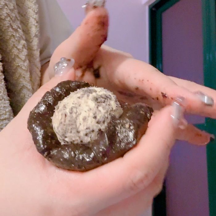 1️⃣ 外皮:將奧利奧餅乾壓碎,加入鮮奶攪拌均勻,再搓成小圓球。