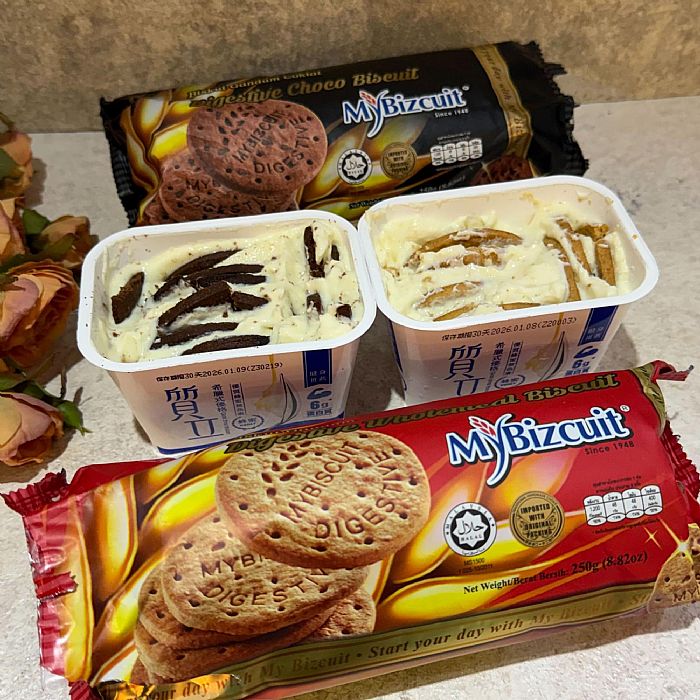 麥比客經典消化餅口感酥脆、麥香明顯,就算吸收優格後也不會糊爛,反而變得濕潤細緻。原味、果味、巧克力三種口味都很適合這個做法,想清爽一點選原味,想甜一點就選巧克力,變化很自由。