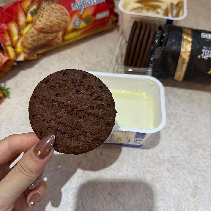 做的時候只要把消化餅一片一片插進優格裡,建議插得密一點、多放幾片,餅乾之間彼此支撐,冷藏後整體口感會比較完整。
