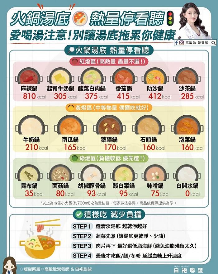 台灣人最愛吃火鍋,尤其是入冬吃火鍋的頻率更是高,火鍋的種類也非常豐富,但你知道火鍋湯底的熱量其實很高嗎?高敏敏營養師就在社群分享了各類常見的火鍋湯底熱量,熱量最高的竟然很多人愛的「麻辣鍋」,到底火鍋湯底要怎麼選才可以降低負擔,愛吃鍋的這篇一定要仔細看!(內文向下閱讀)