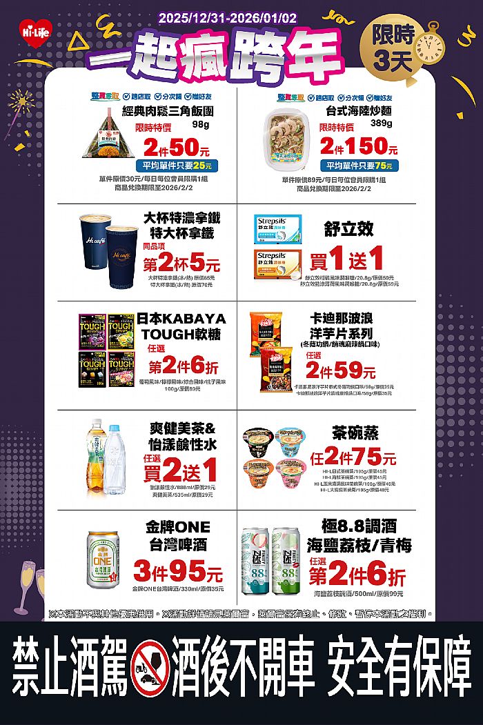 迎接2026年跨年倒數,台北跨年活動規模再升級,台北101跨年煙火、重量級跨年晚會卡司輪番登場,台北大巨蛋跨年演唱會同步吸引大批歌迷湧入信義計畫區。看準跨年夜「即時補給、就近消費」需求大爆發,萊爾富提前全面備戰,從門市動線、人力配置到商品優惠一次到位,成為跨年夜最強補給站。