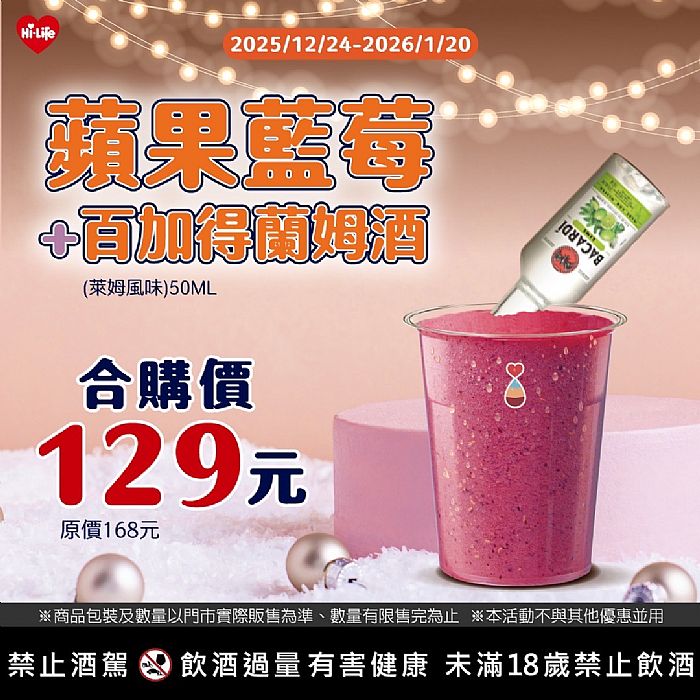 今年果C果昔首度加入跨年戰場,12月31日限定「果昔女神日」,七款人氣口味任兩杯99元,包括「莓完莓了」、「蘋果藍莓」、「鳳梨芭樂」、「綠的拿鐵」、「曖昧打翻了」、「奇怪ㄟ檸」、「檸芭檸檸」,更驚喜推出跨年派對調酒新喝法「蘋果藍莓果昔」搭配百家得蘭姆酒-萊姆風味,組合價129元,清爽果香與微醺酒感完美融合,無論是在跨年現場、朋友聚會或回家續攤,一杯在手就能 Chill 嗨迎新年。