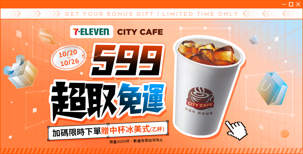 加碼限時下單贈中杯冰美式活動一:7-ELEVEN超取599免運