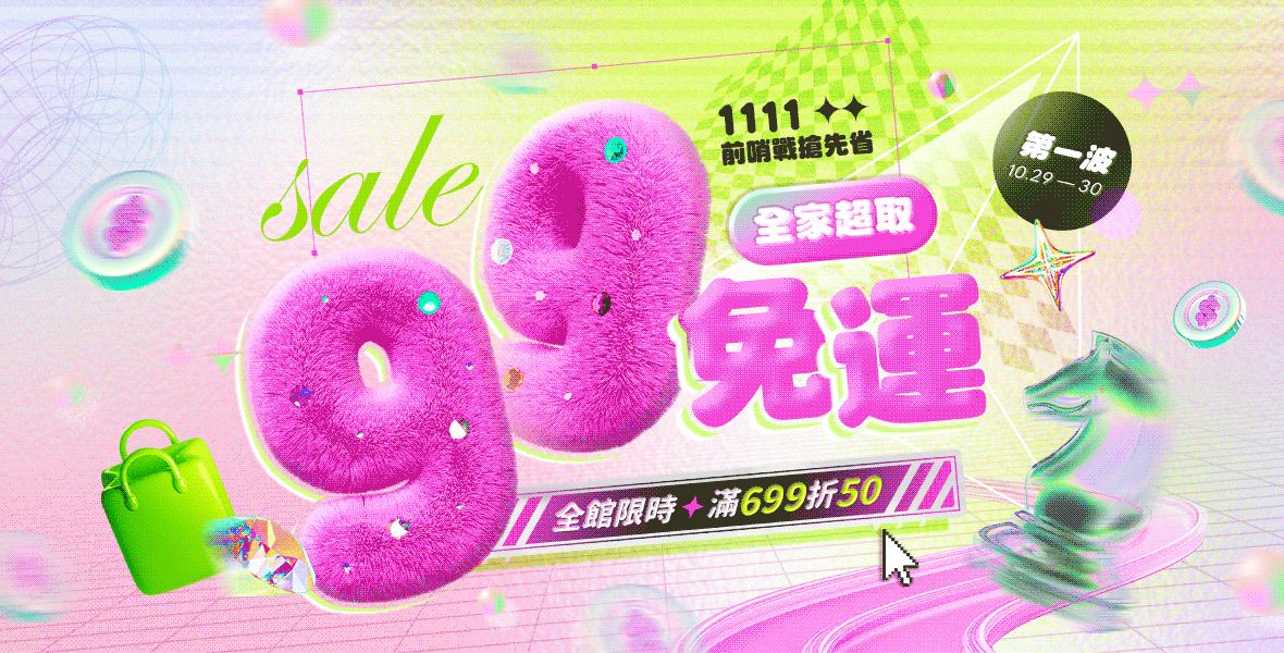 第一波:全館限時99免運,滿699現折50!活動一:全家超取99免運