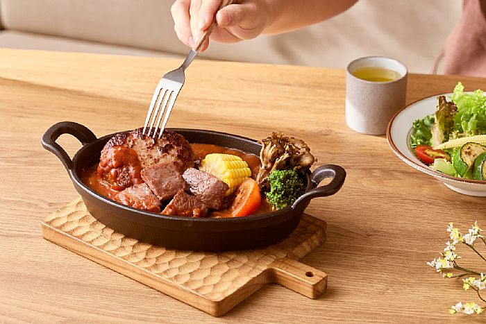 主打和風洋食的「陶板屋」,套餐從沙拉、主餐到甜點飲品共七道料理,每客698元,10/22將迎來13道新菜色,新主餐「和牛漢堡排佐炙烤牛排」,厚實多汁的和牛漢堡排與炙烤牛排,搭配主廚特製的濃郁紅醬,風味層次分明。加價108元可升級「法蘭克牛排」,嚴選牛後腰脊部位,油花緻密卻不油膩,口感軟嫩香氣十足。