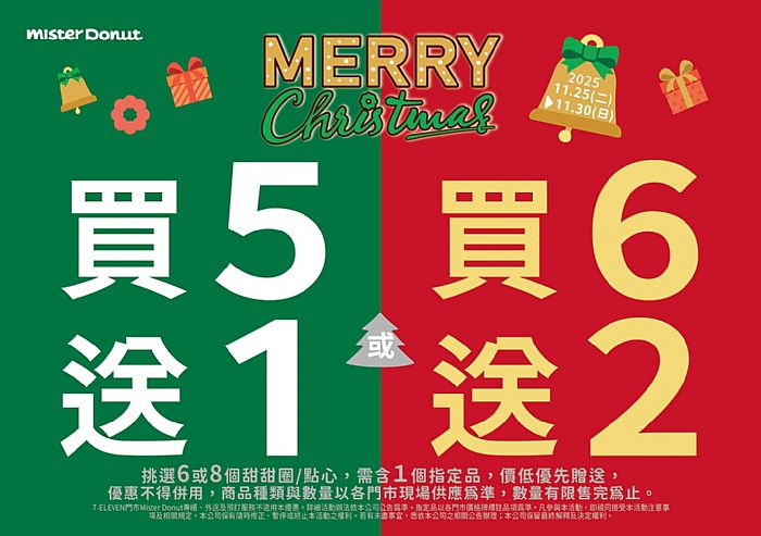 為迎接新品上市,Mister Donut同時推出限時優惠,只要於11月25日至11月30日期間購買指定商品,即可享買5送1及買6送2優惠,讓Mister Donut伴粉絲們熱鬧過節!
