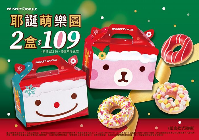 甜蜜祝福就由「耶誕萌樂園」來傳遞!小小ㄧ盒同時擁有草莓、蘋果、優格三種風味的迷你甜甜圈,甜甜圈紙盒也擁有滿滿的耶誕氛圍感,「耶誕萌樂園」還有兩入109元的甜甜價!