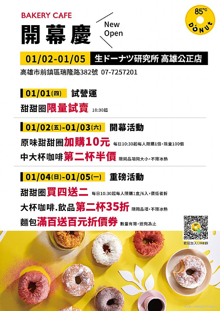 2026年元旦試營運的還有生甜甜圈.85℃公正研究所,1/2-1/3每日早上10點半開始,原味甜甜圈加價購10元(限量100個、每人限購一個),中大杯咖啡第二杯半價;1/4-1/5甜甜圈買四送二,大杯咖啡/飲品第二杯35折,麵包滿百送百元折價券。