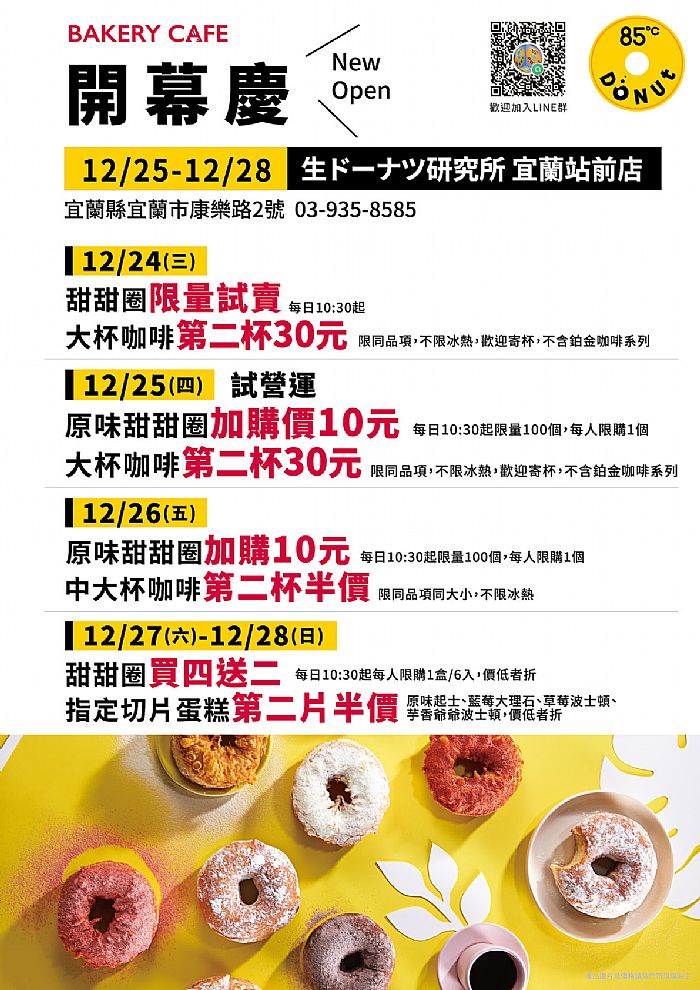 12/24平安夜,生甜甜圈.85℃宜蘭研究所從早上10點半開始限量試賣,還有大杯咖啡第二杯30元活動;12/25原味甜甜圈加價購10元(限量100個、每人限購一個),大杯咖啡第二杯30元;12/26原味甜甜圈加價購10元(限量100個、每人限購一個),中大杯咖啡第二杯半價;12/27-12/28甜甜圈買四送二,指定切片蛋糕第二片半價。