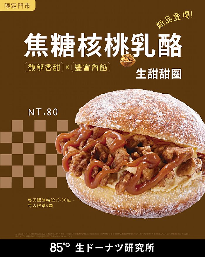 生甜甜圈.85℃復興研究所8月在台中開幕,除了販售85℃原本既有的咖啡、蛋糕和麵包等商品外,也首次嚐試賣生甜甜圈,使用日本大廠奧本麵粉加入湯種特製,高含水量且經過14小時低溫發酵的生甜甜圈麵團,在高溫油炸後,內裡柔軟細緻,入口蓬鬆濕潤又不失嚼勁,開幕三個月每天四小時1200個全部賣完;10月開出「板橋研究所」與「逢甲研究所」兩間店,甜點熱潮一路向北延燒再轉往南部地區,12月到2026年元旦一口氣開出八間門市,分別在新莊、三重、彰化員林、屏東內埔、宜蘭、台中烏日、后里和高雄公正研究所。