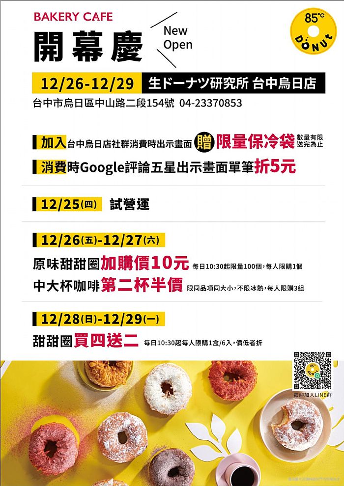 生甜甜圈.85℃烏日研究所,12/25試賣,12/26-12/27每日早上10點半開始,原味甜甜圈加價購10元(限量100個、每人限購一個),中大杯咖啡第二杯半價;12/28-12/29甜甜圈買四送二;開幕期間加入烏日研究所社群,消費時出示畫面即贈限量保冷袋(數量有限、贈完為止),出示GOOGLE評論五星畫面單筆折5元。