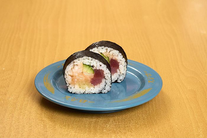 「沢庵鮪鮭卷」由 鮪魚、鮭魚泥、醃漬日式黃蘿蔔與小黃瓜捲製而成,黏香濃郁的鮭魚泥油脂與清爽食材相互 襯托,風味平衡、口感層次豐富,飽足感十足。