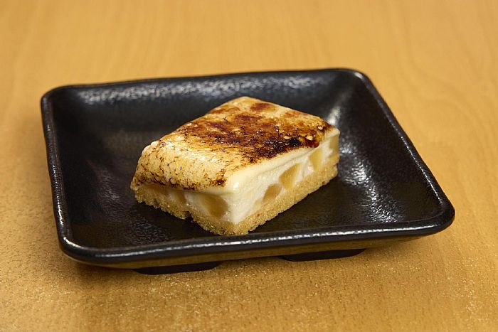 「蘋果香草 布蕾冰糕」為台灣少見的甜點品項,靈感源自法國傳統甜點席布斯特(Chiboust cake),底 層為濕潤厚實的杏仁蛋糕,依序鋪滿大量的蘋果果肉,再覆上蓬鬆輕盈的香草風味慕斯,最 後於頂端炙燒出一層酥脆焦糖,層次分明、風味細緻華麗。