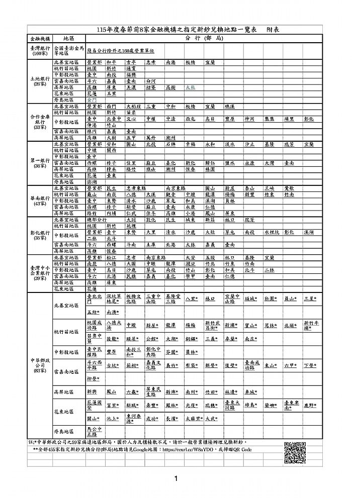 中央銀行表示,2026年新鈔兌換共選定456家分行 作為指定兌鈔地點,由8家金融機構 共同配合辦理,包含 臺灣銀行、臺灣土地銀行、合作金庫商業銀行、第一商業銀行、華南商業銀行、彰化商業銀行、臺灣中小企業銀行,以及 中華郵政公司(郵局),提供民眾就近辦理新鈔兌換服務。