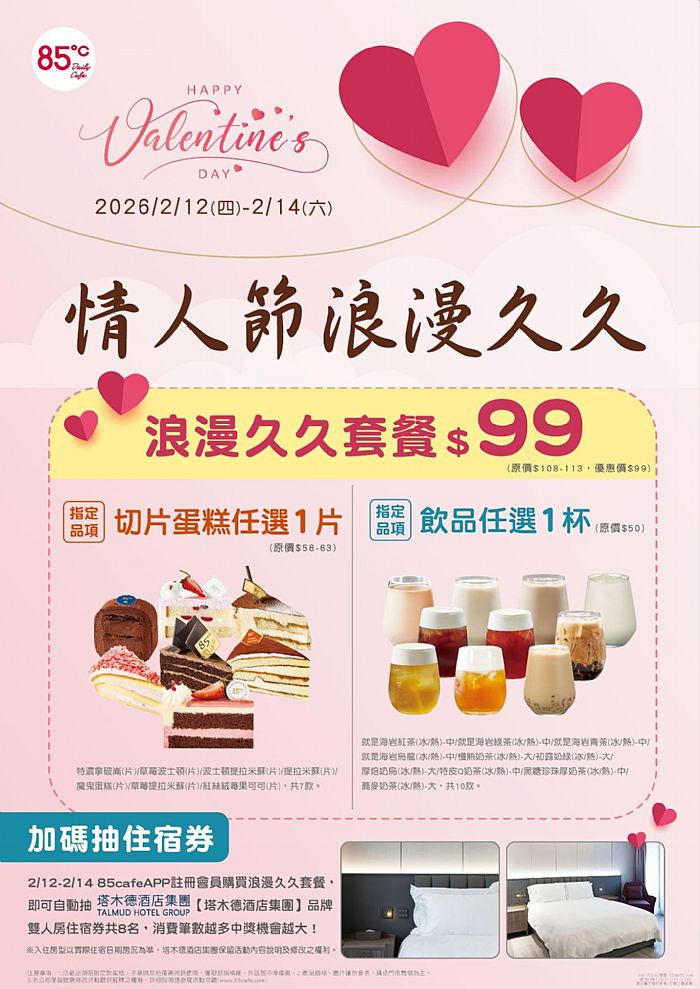 浪漫西洋情人節,85℃推出浪漫久久套餐,指定切片蛋糕任選一片,搭配指定飲品一杯,優惠價99元。85 Cafe APP註冊會員購買浪漫久久套餐,即可自動抽雙人房住宿券共8名,消費次數越多中獎機會越大。