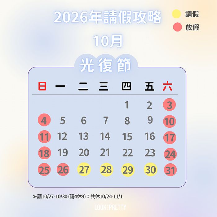 ➤請10/27-10/30 (請4休9)👉共休10/24-11/1
