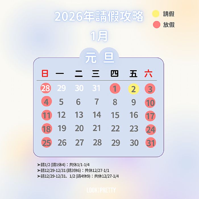 ➤請1/2 (請1休4)👉共休1/1-1/4
