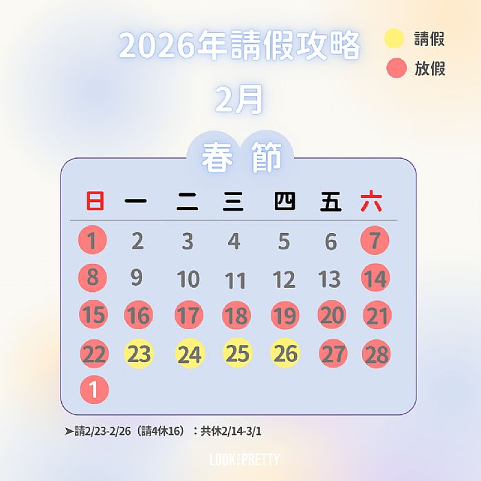 ➤請2/23-2/26 (請4休16)👉共休2/14-3/1