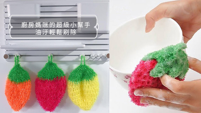 洗鍋布,這可不是一般菜瓜布呀,特殊材質不易沾油,增加洗碗效率~造型還是超可愛的草莓圖案,設計貼心小掛勾可以晾乾喔。