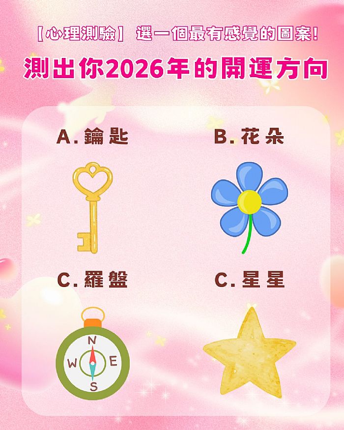 心理測驗時間到啦~迎接2026年,有時候比起行動,我們的直覺其實更容易被「圖案」吸引。請憑第一眼的感覺,選出一個最對你胃口的新年圖案,看看你在2026年真正的開運方向是什麼,下滑看結果吧(內文向下閱讀)