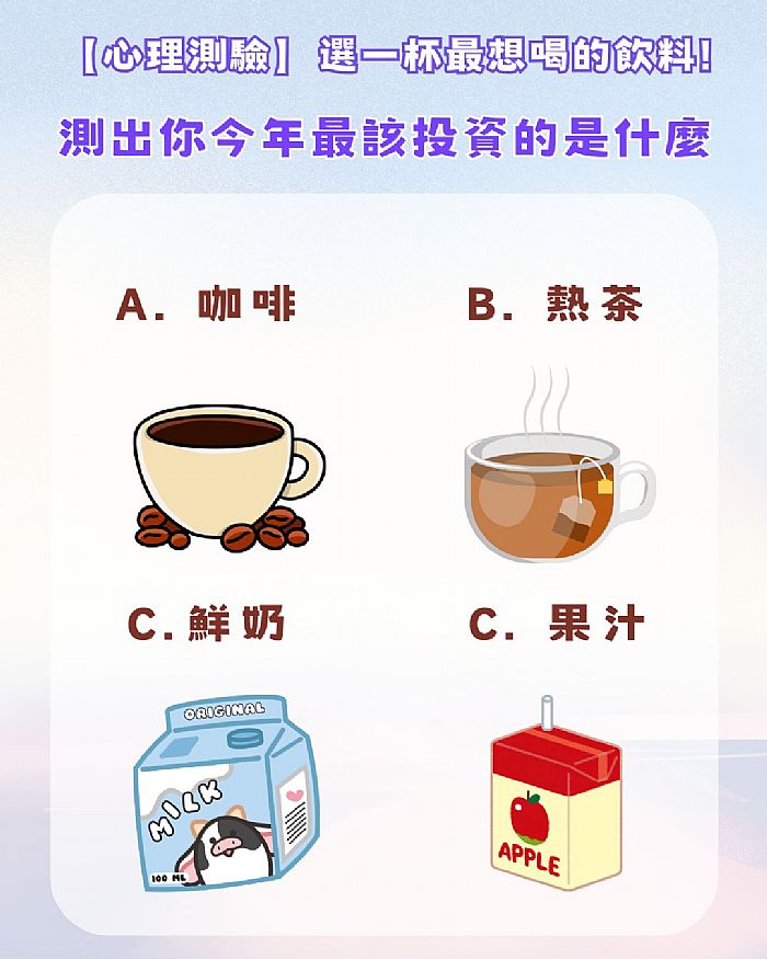 心理測驗時間到啦~2026年最值得投入的資源,不只是股票基金,還包括健康、關係、技能和夢想。請憑第一直覺,選一杯此刻最想喝的飲料,看看今年你最該把資源投資在哪裡,下滑看答案吧!(內文向下閱讀)