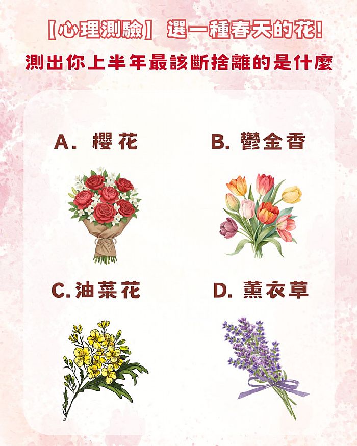 心理測驗時間到啦~春天是整理的季節,該清空的不只是衣櫃和雜物。請憑第一直覺,選一種此刻最吸引你的春天花朵,看看2026上半年你最該斷捨離什麼,才能讓身心真正輕盈起來,下滑看答案吧!(內文向下閱讀)