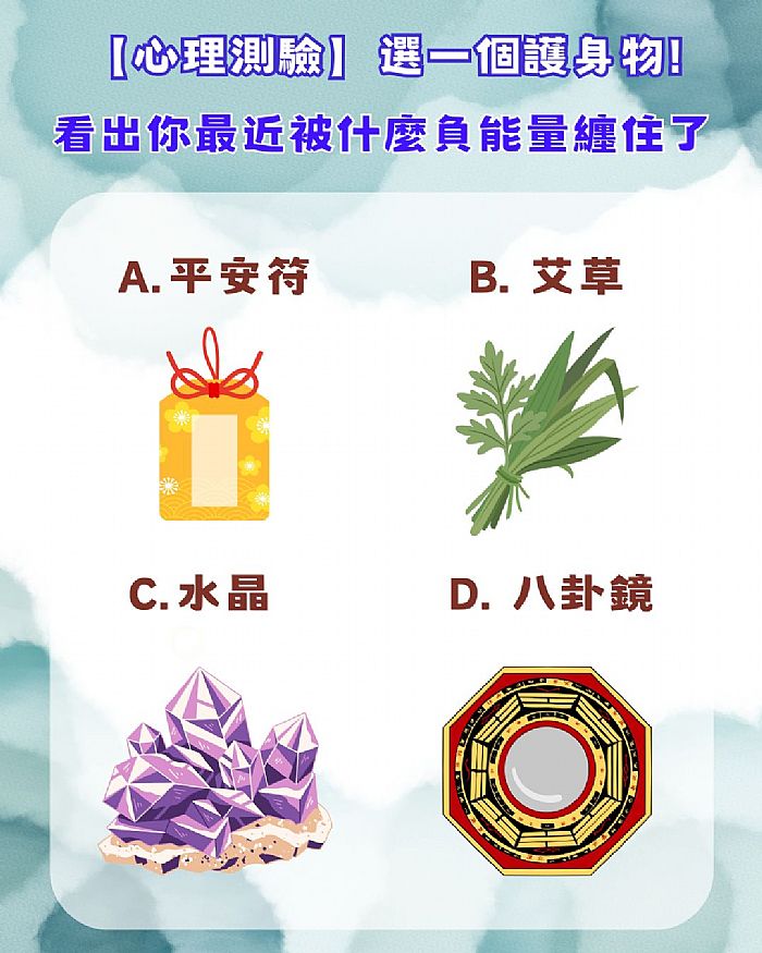 心理測驗時間到啦~最近總覺得諸事不順、身心疲憊、做什麼都卡卡的?可能是被負能量纏住了。請憑第一直覺,選一個此刻最想帶在身上的護身物,看看你最近被什麼負能量影響,該如何化解才能重新順起來,下滑看答案吧!(內文向下閱讀)