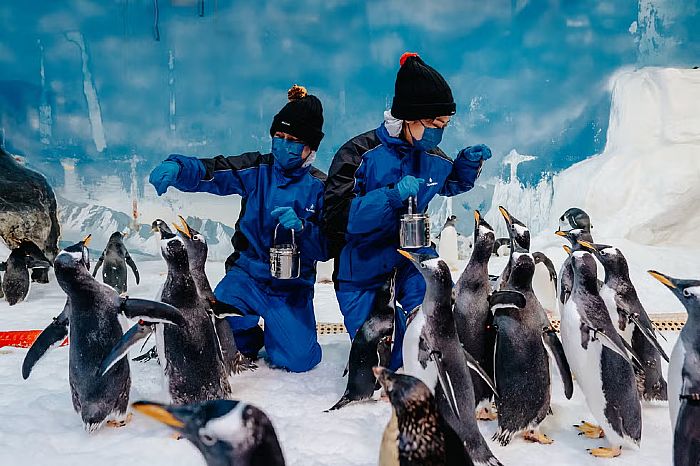 活動期間世界水域館極地區的場景也全面換上聖誕新裝,雪白聖誕樹、雪屋打卡牆,一踏進去就像掉進冷冷的極地世界,還能看到企鵝跟鳳頭海鸚鵡的一舉一動,今年剛好又有企鵝寶寶加入,更是可愛度爆表。