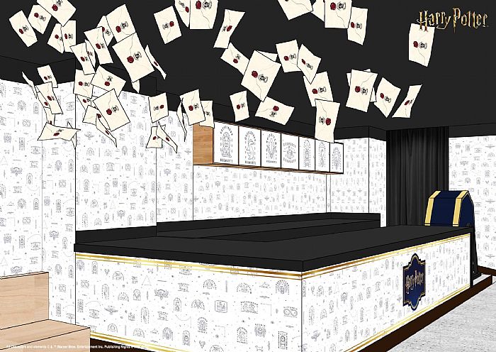 接著來到「入學通知區」,天花板上飛舞的信件雨,每一封霍格華茲錄取信都象徵著夢想成真。
